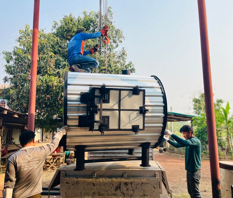 Today, more than 200 Khokbawa machines are operating across Thailand and other countries, from small units to systems producing up to 3 tons of biochar per day. Because we design and build our machines in-house, capacity is not a fixed limit. Larger systems can be developed as demand grows.